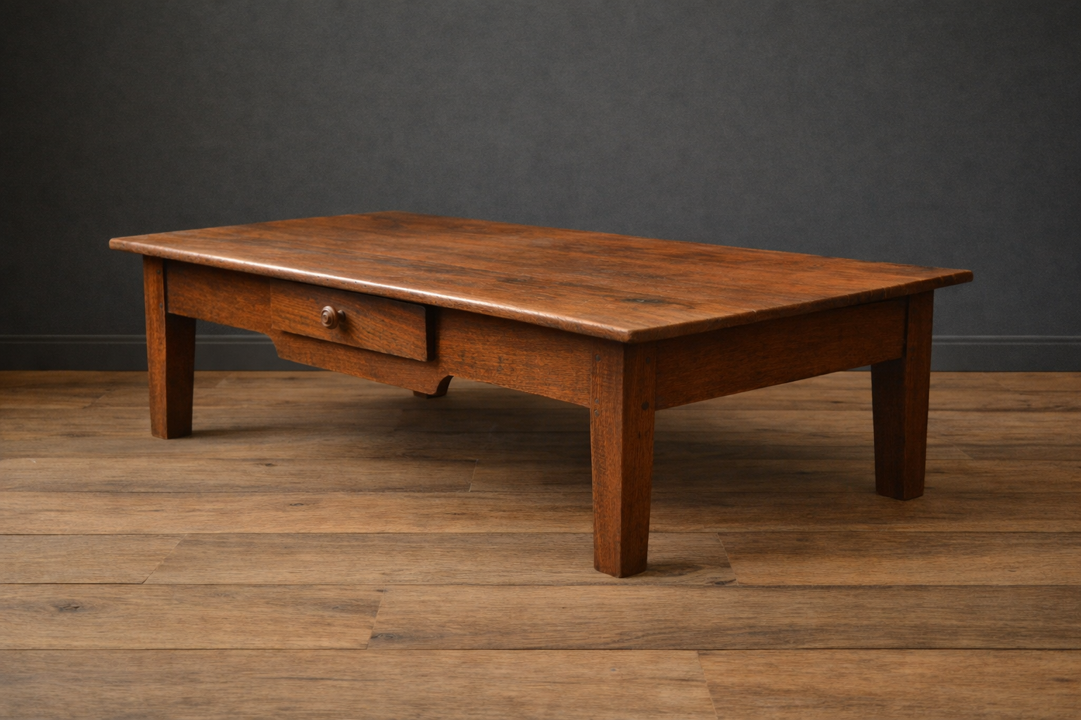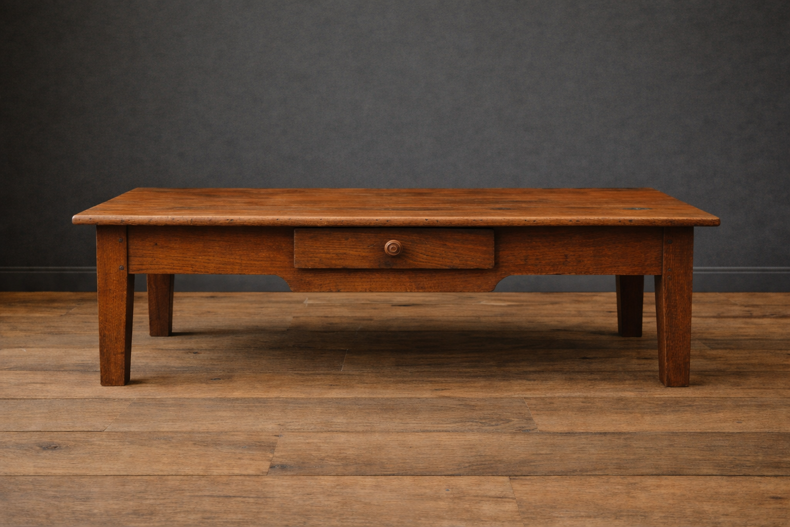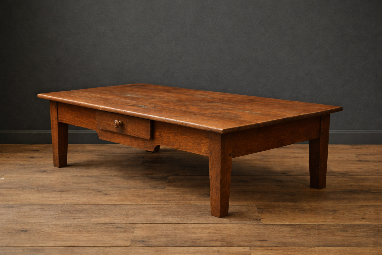 Deze 19e eeuwse stoere, Franse salontafel is van eikenhout gemaakt, met 1 royale laden aan de lange zijde in het midden van de tafel. De tafel heeft een prachtige doorleefde en landelijke uitstraling.
