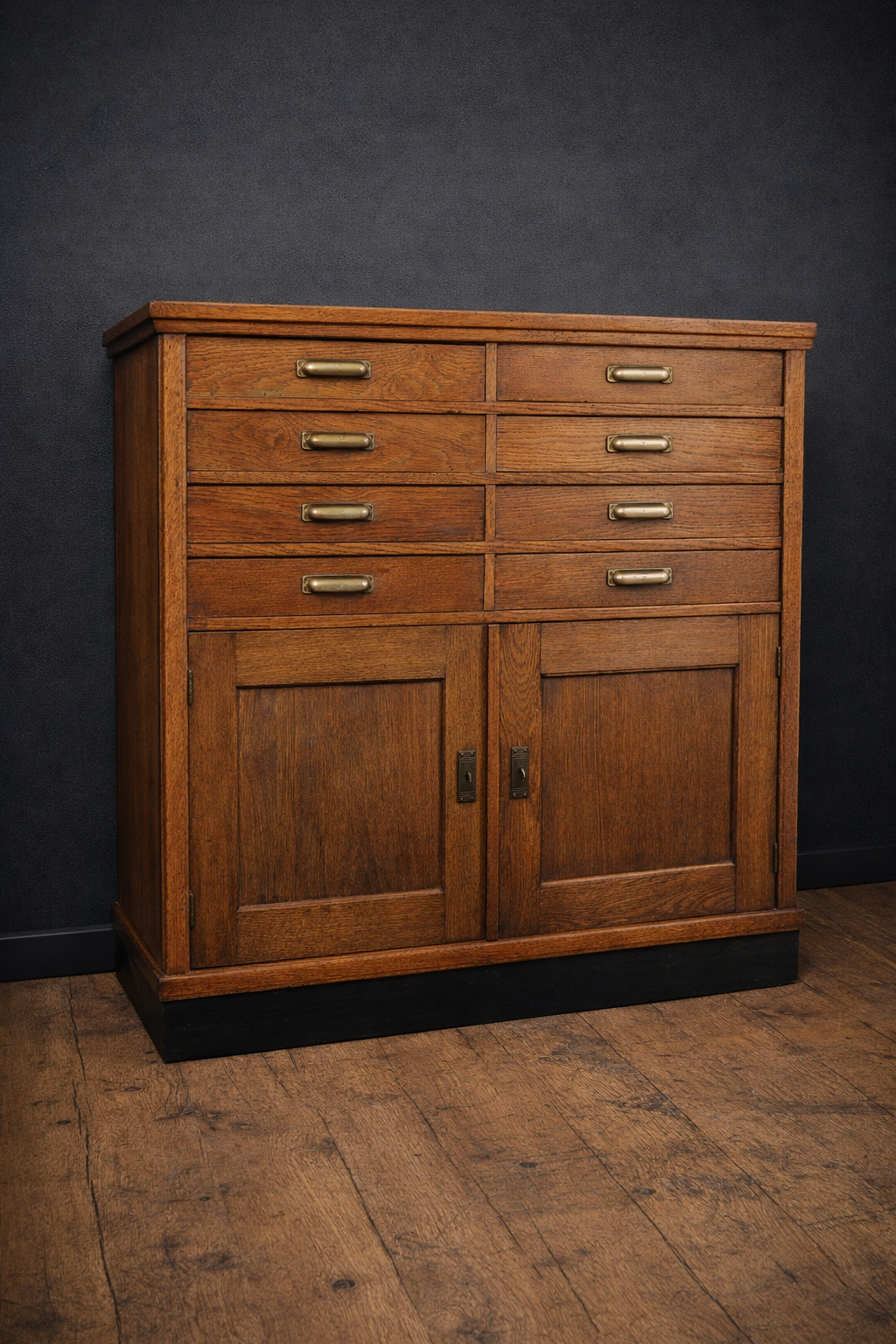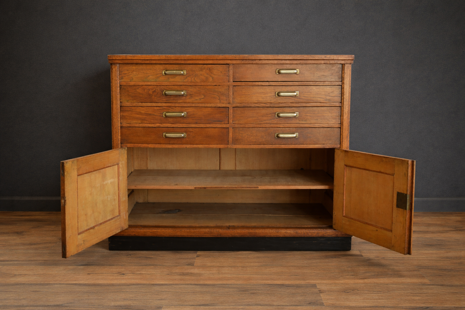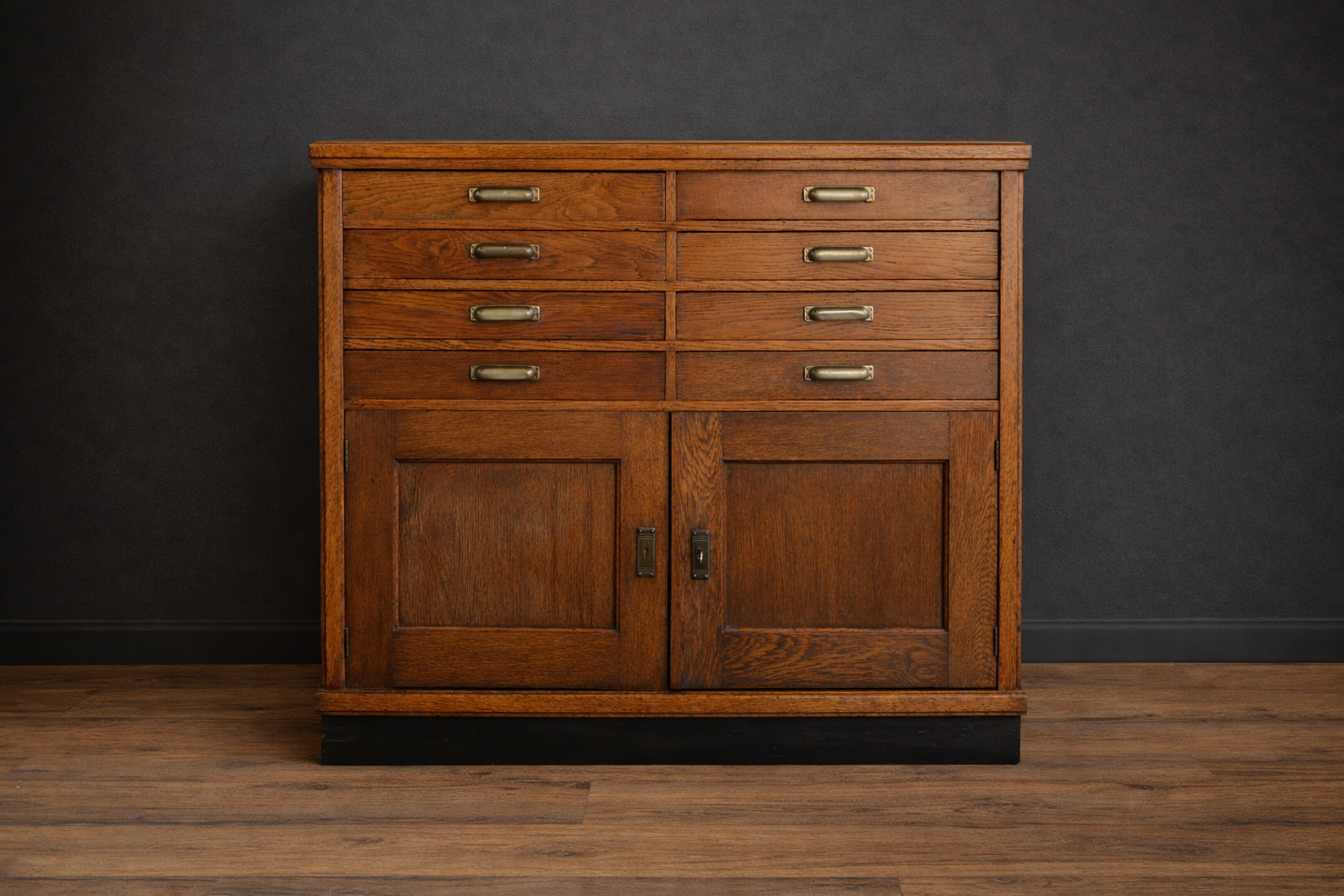 Eikenhouten Amsterdamse School restaurantmeubel met in totaal 8 laden en daaronder een opbergruimte met een schap. Het meubel werd gebruikt voor bestek en borden e.d.Nu is hij handig voor allerlei zaken maar zeker ook weer voor borden en bestek!