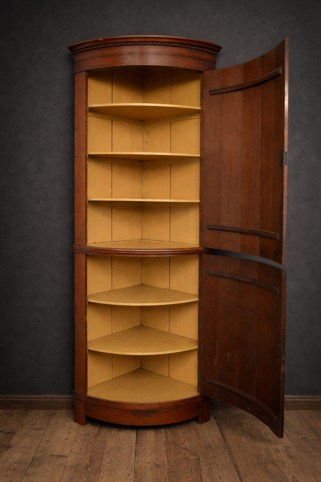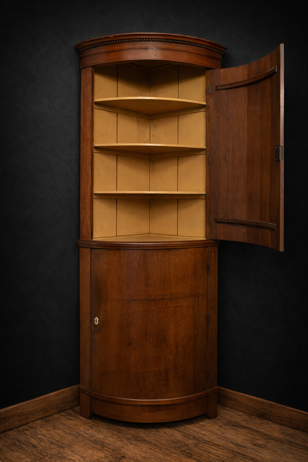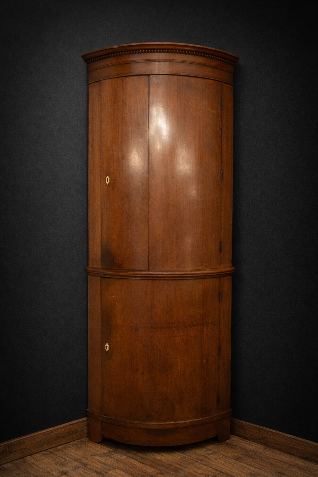 Kapitale, bijzonder fraaie, strak uitgevoerde eikenhouten hoekkast.. Het interieur bevat maar liefst 7 afleg niveau's!Deze kast is zeer ruim inzetbaar, zowel in een klassieke omgeving; maar zeker ook in een zeer modern interieur.